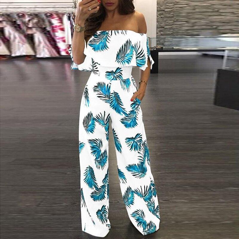MCHPI Store New Off Shoulder Ruffle Jumpsuit Feather Print Playsuit